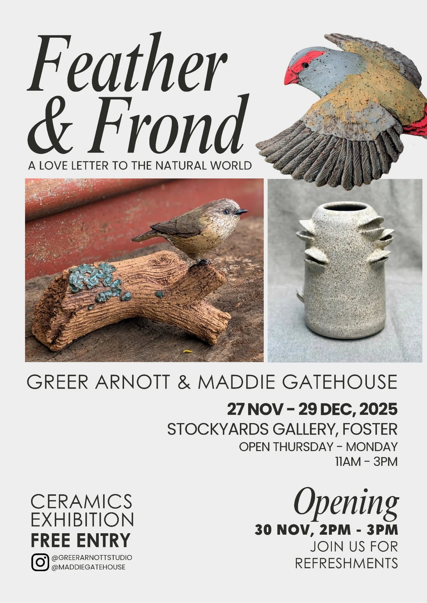 I am very excited to give you my latest collection of ceramic bird sculptures, paintings and more alongside another brilliant ceramicist Maddie Gatehouse.
